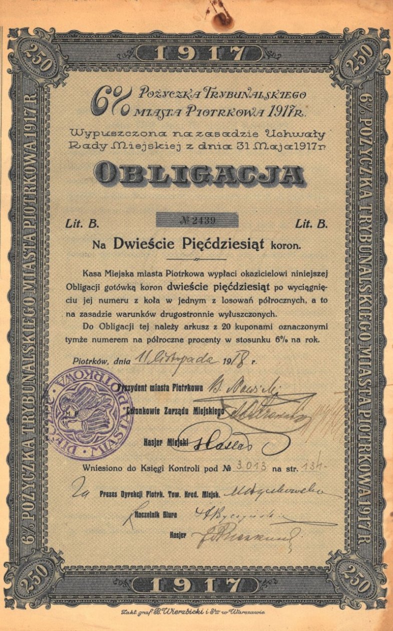 W dniu 11 listopada 1918 roku Rada Regencyjna przekazała wracającemu do Polski Józefowi Piłsudskiemu zwierzchnią władzę nad wojskiem, co pod koniec II Rzeczpospolitej zostało uznane za oficjalną datę odzyskania przez Polskę niepodległości. W dniu 11 listopada 1918 roku została także wystawiona prezentowana 6% obligacja Piotrkowa Trybunalskiego. Potraktujmy ją jako symboliczny pierwszy papier wartościowy Niepodległej.