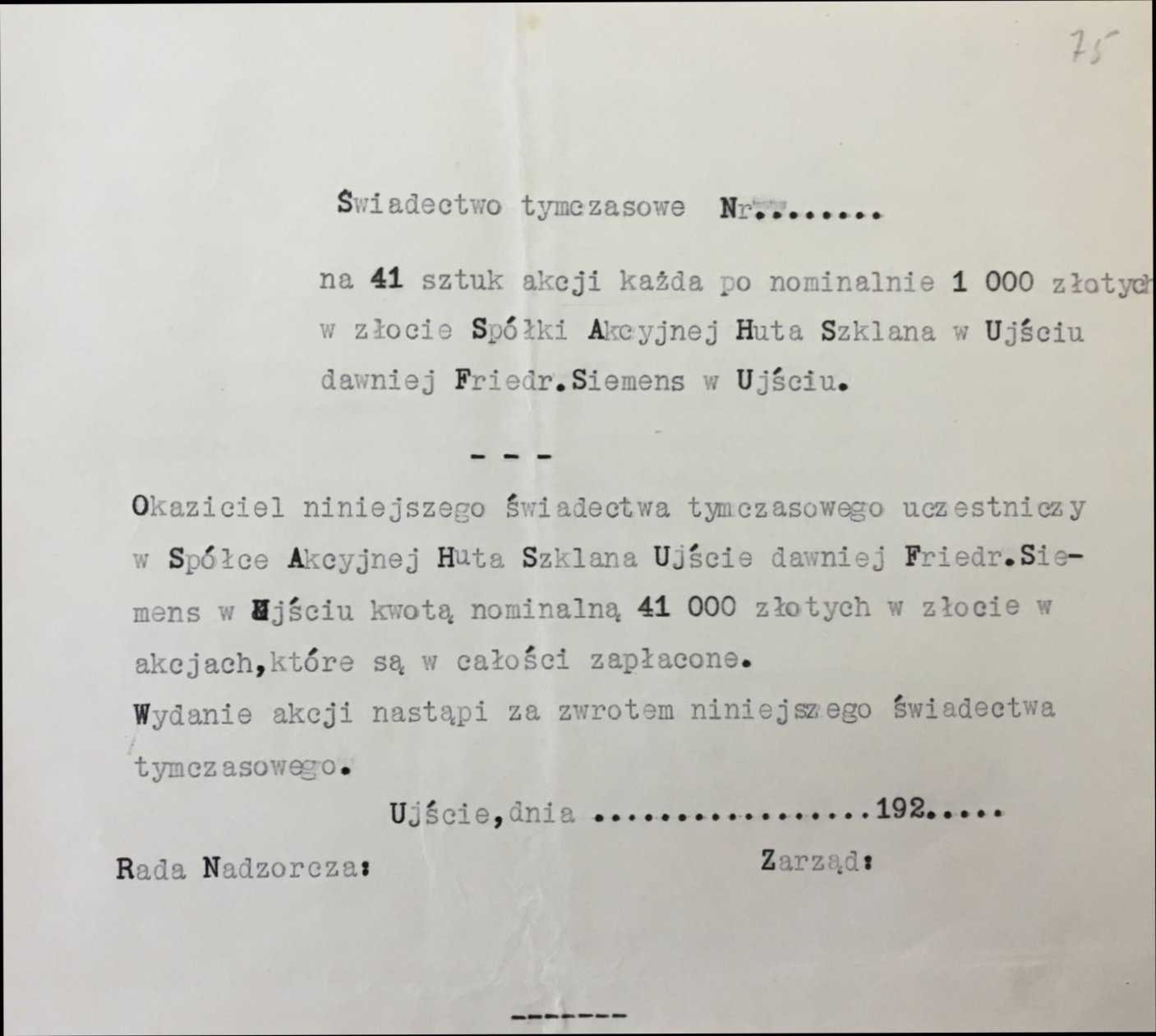 Dokumentów akcji nie ma, fabryka stoi i działa (no może nie całkiem, tylko ta w Ujściu, po fabryce w Dziembówku nie ma śladu z wyjątkiem torfowisk wykorzystywanych do opalania pieców hutniczych), więc może chociaż zaraportujmy o przygotowanych wzorach akcji i świadectwa tymczasowego. Dokumenty były tworzone jako załączniki do dokumentacji rejestrowej, prywatnie w spółce, nie korzystano z drukarni (źródło: akta Huty Szkła „Ujście” w Archiwum Państwowym w Poznaniu, Oddział w Pile).