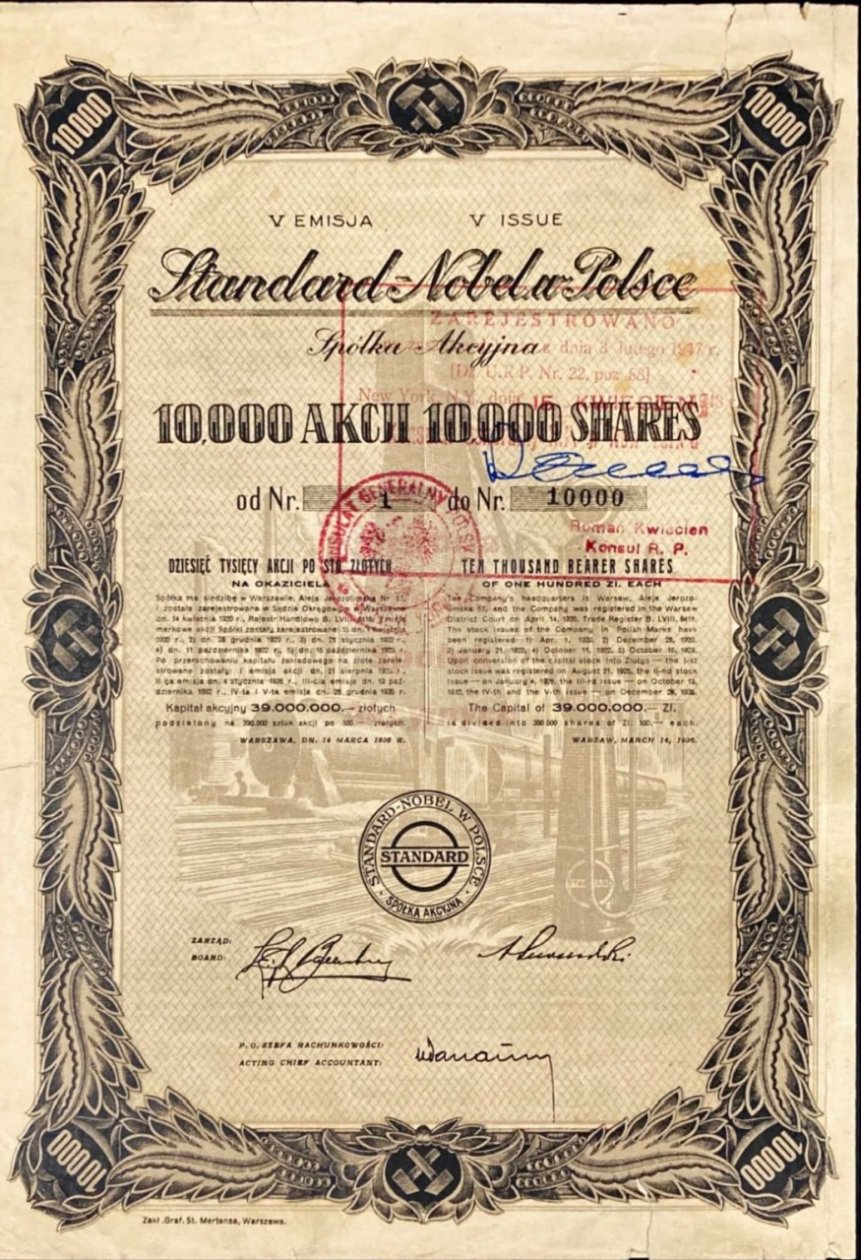 Nim przejdę do odpowiedzi, to pozwolę sobie na postawienie hipotezy, że akcje III emisji Standard Nobla S.A. też były wydawane w odcinkach po „10.000”, „100”, „5” i „1” akcja. Znane numery „1” i „5”, to podobnie jak w przypadku V emisji bardzo wysokie numery, kapitał był jeszcze wyższy, gdyż wynosił 60.000.000 zł, spółka była kontrolowana przez kapitał amerykański, to wszystko przesądza, że nie było sensu, ani potrzeby zadrukowania gargantuicznych ilości papieru. Większość emisji można było „skoncentrować” w odcinkach „milionowych”.