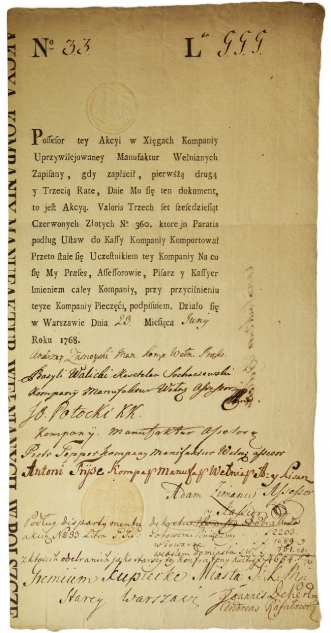 Z pewnością tym co napędza emocje są rekordy cenowe, zatem nie unikniemy pytań o najwyższe zapłacone ceny. Bezdyskusyjną rekordzistką pozostanie na bardzo długo akcja Kompanii Manufaktur Wełnianych (tzw. pierwsza polska akcja) sprzedana na aukcji Salonu Numizmatycznego Mateusza Wójcika (SNMW) za cenę 84.000 zł netto. Na miejscu drugim odnotowujemy transakcję akcją pierwszej spółki Drogi Żelaznej Warszawsko – Wiedeńskiej za cenę 9.500 zł netto, która miała miejsce na aukcji NumisPoland Krzysztofa Klitończyka, a na miejscu trzecim ponownie Salon Numizmatyczny Mateusza Wójcika z 5% Obligiem Skarbu Królestwa Polskiego sprzedanym za cenę 7.250 zł netto.